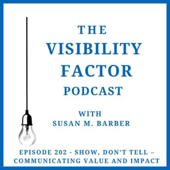 202. Show, Don’t Tell – Communicating Value and Impact In this episode of the Visibility Factor podcast, host Susan M Barber expresses gratitude to listeners and discusses the...